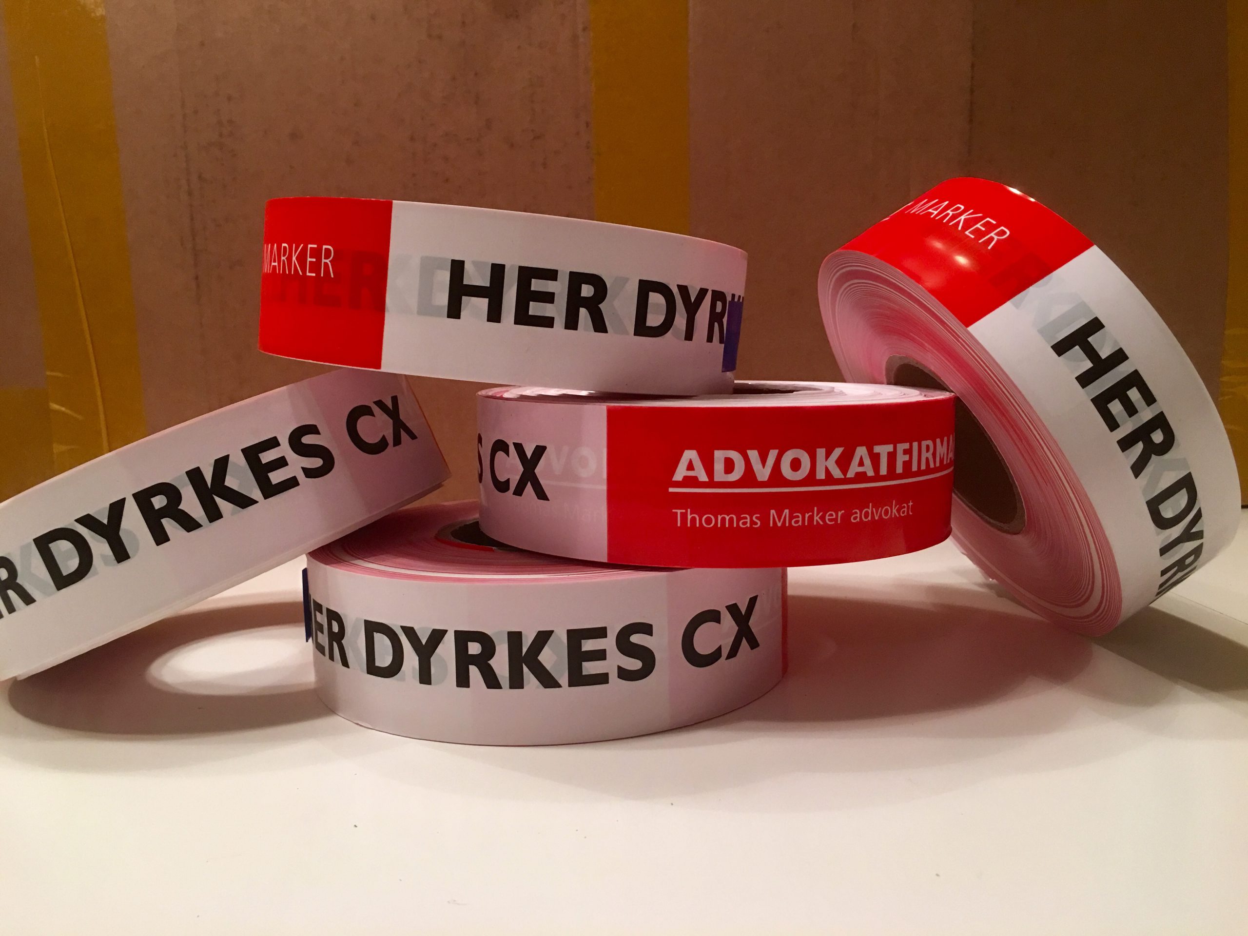 En typisk rulle som på fotoet ovenfor i 50 mm koster kr. 120,- pr. rulle plus antal klichér, i dette tilfælde to stykker, standard sort og standard rød (PMS 200 C).