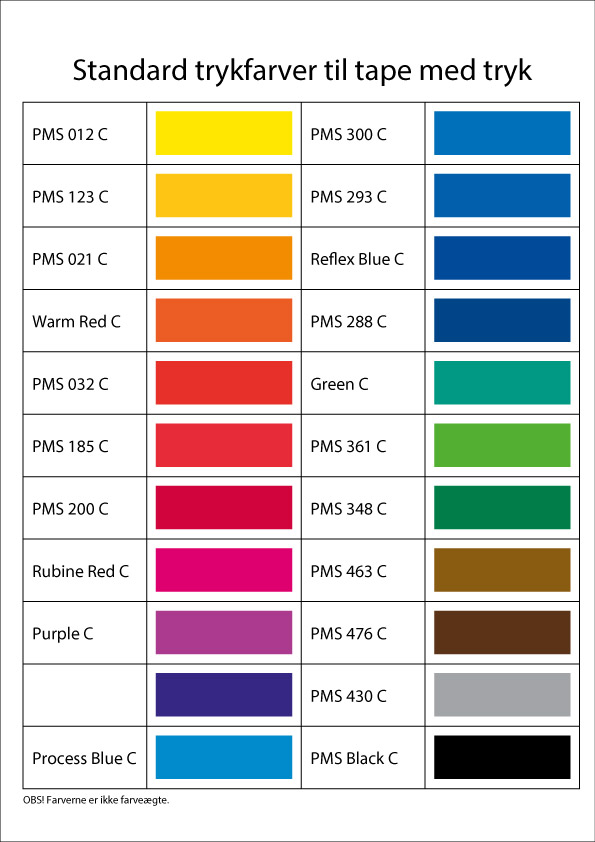 Hvis du ønsker speciel farver kan det naturligvis også arrangeres, hver special farve koster kr. 195,-. Der er mulighed for at lave et såkaldt “farveskifte” undervejs i produktionen, så du med det samme logo kan f.eks. lave halvdelen med en farve, og den anden halvdel med en anden, pris 195,-. Se vores standard farver nedenfor.